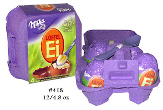First we have an interesting but very rich Easter treat from Germany made by Milka in France.  These are Milka Lil Scoops.  Nice and sweet milk chocolate Easter Eggs filled with a light and fluffy white mousse.  Each egg is individually wrapped and with its own spoon to scoop out the yummy goodness.