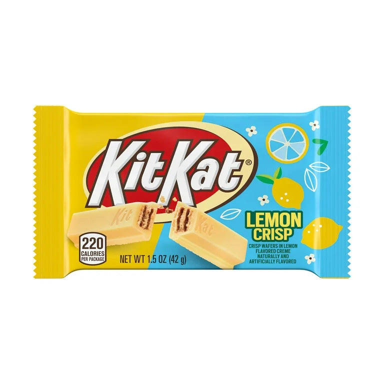 Your favorite crunch and chocolate now in a crisp Lemon flavor! 1.5 oz Satisfy your cravings with a zesty twist! This Kit Kat Lemon Crisp brings together the perfect balance of crunch and chocolate in a refreshing citrus flavor. With 1.5 oz, it's just the right amount to indulge in without feeling guilty (even if you go for seconds).