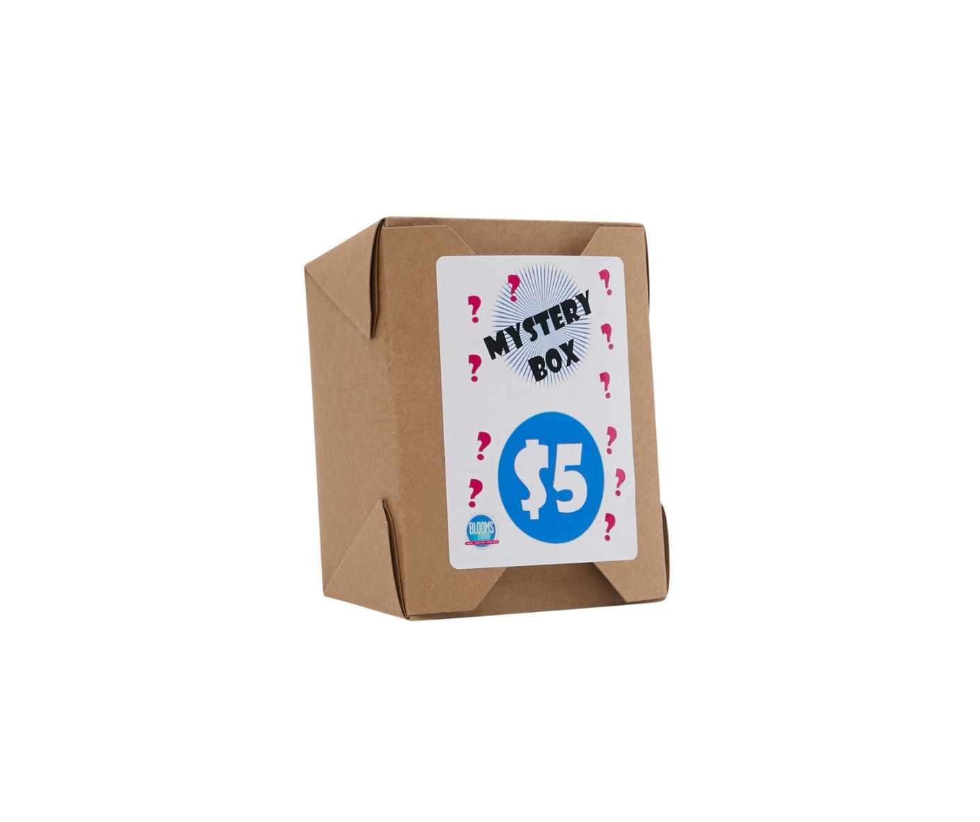 Kraft paper box with a 'Mystery Box $5' card on a white background